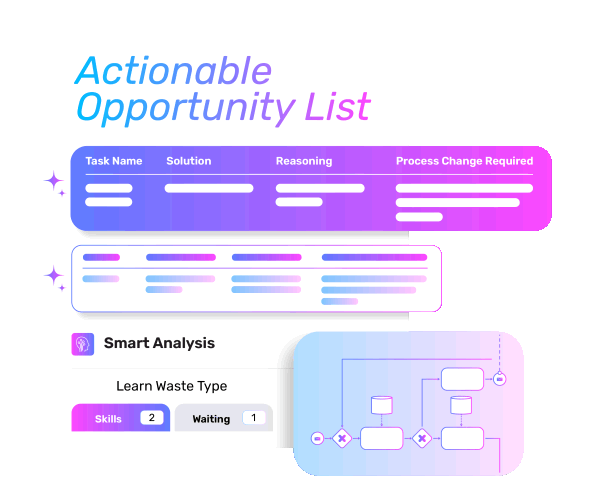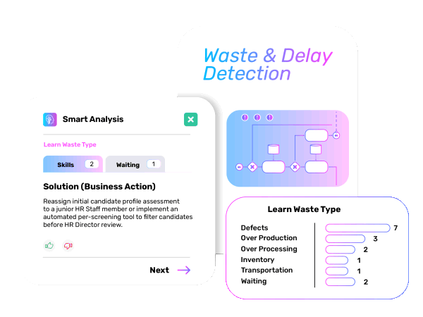 Automatically pinpoints bottlenecks, redundant steps, rework loops, excessive approvals, and waiting times across your processes—so you know exactly where time, effort, and cost are being wasted.