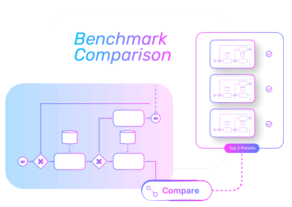 Benchmarks your processes against internal best practices and industry standards to highlight performance gaps and improvement potential, without relying on external consultants or lengthy benchmarking exercises.