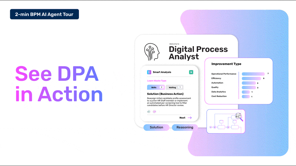 Power your process improvement projects with actionable, AI-powered insights delivered by PRIME BPM’s Digital Process Analyst (DPA).
